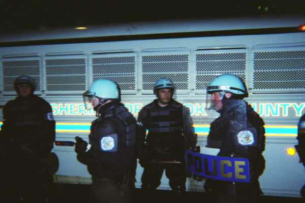 Chicago Police Department outfitted 1,200 cops in new riot gear ($180) to "protect the freedom of speech" of about 1,000 anti TABD protesters in Chicago on November 7, 2002. I have been to protests both in the US and in Argentina and I have never felt so threatened by the police presence. Once you joined the protest you could not leave without being arrested. It was a peaceful, non-voilent protest. But I believe credit goes to the organizers and participants--not the police.