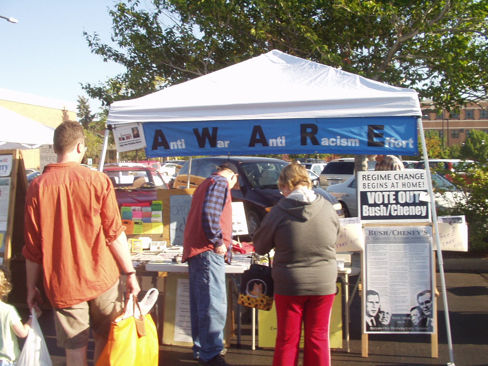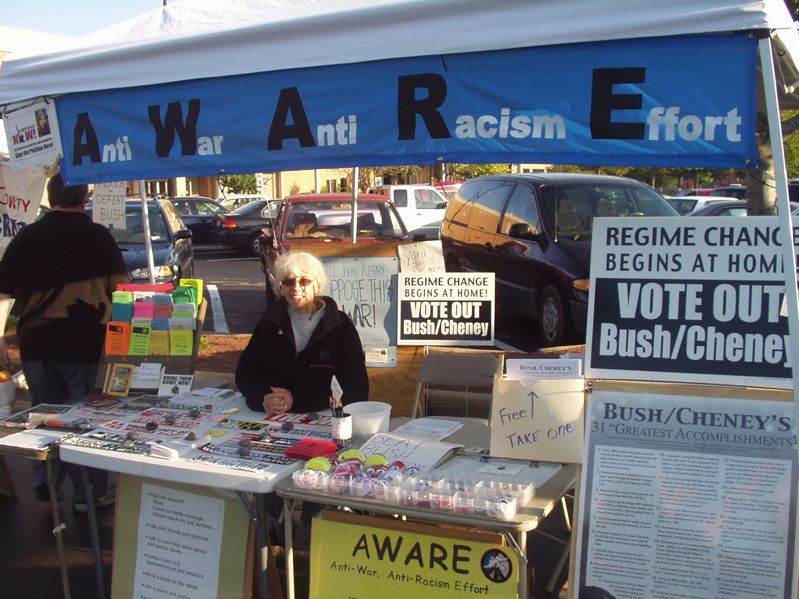 Our public presence and the public's presence at our table go beyond any kind of monetary profit and beyond "breaking even", because the human connection, hope and an expectation for the future is alive and growing each week. The hope is fundamental - folks come by each week, sometimes just to say hi and often to make sure that we are still there. We look back and know our "radical presence" is bringing comfort and hope. The light at the end of this dark tunnel grows brighter one button, yard sign, bumper sticker and free piece of information at a time. We know voting Bush out is just the beginning of our work. Lots of work after that lies ahead for AWARE! The challenges are huge but the commitment is strong!