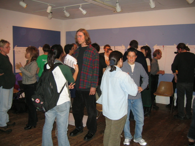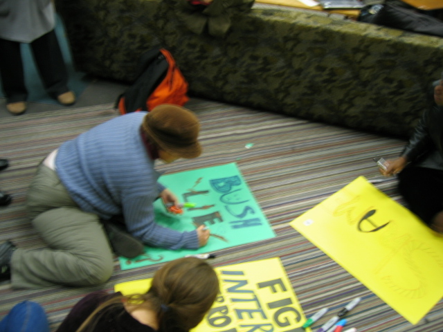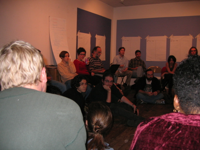 People raised many concerns during the discussions and socializing including: the war on terror, civil rights violations, election tallies, energizing the peace movement, first ammendment violations, polarization of the country, decreasing tolerance, the draft, neoconservatives, war, increasing feminism, right wing agendas, healthcare, education, social regression, activating youth, civil liberties, political disengagement, cooptation of language, using the language of our oppressors, conservation, environmentalism, mainstream media, economic structural adjustment, repression of dissent, arrogance, cooptation of the "moral" and "religious" by the right, dissenfranchisement of minorities, facism in America, abortion, connecting the local to the national, outreach (both within the left and to the right) and education, unequal representation of constituencies in government, art, political appointments, human rights, empire, mysogyny, law enforcement, visas, blowback and opposition, demoralization, gay rights, dumb discourse, angry liberals, infighting, paying attention to the rightwing, death of soldiers, women's rights, the rhetoric of Kerry's submission speech, and revolution.