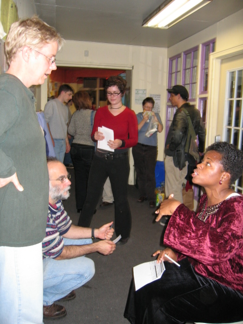 Scores of local community members took part in a hastily assembled Community Meeting and Social to discuss new projects, ideas, and strategies following the 2004 elections. Earlier in the evening community members rallied in the cold and rain at the corner of Race and Main Streets in downtown Urbana to demonstrate against the flawed American election system. Over a dozen projects were unveiled and discussed as people channeled their anger, their concern, and their disappointment -- vowing not to give up hope, lessen in their community engagement, or cease resisting discrimination and the diminution of our civil rights. |