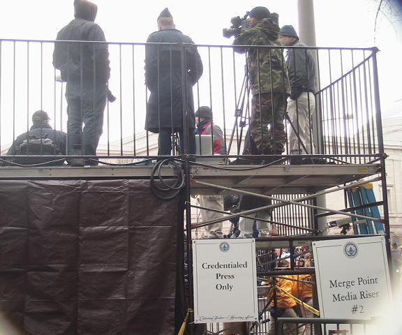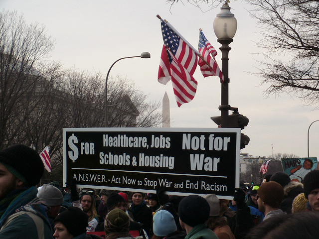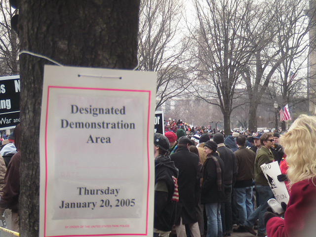 The only permitted protest was sponsored by A.N.S.W.E.R., the anti-war and racism group. Nonetheless, protestors lined up and down the parade route, in some places facing police aggression.