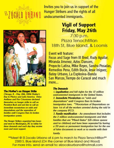 The immigrants of Chicago are leaders throughout the nation, they were the first in going en masse (half million on March 10 and May) and the only city where all the IFCO workers were released without bail. These raids are a form of punishment for everyone who marched for legalization. Currently, some IFCO workers are on hunger strike to protest deportation of workers, and there will be daily marches in Chicago. |