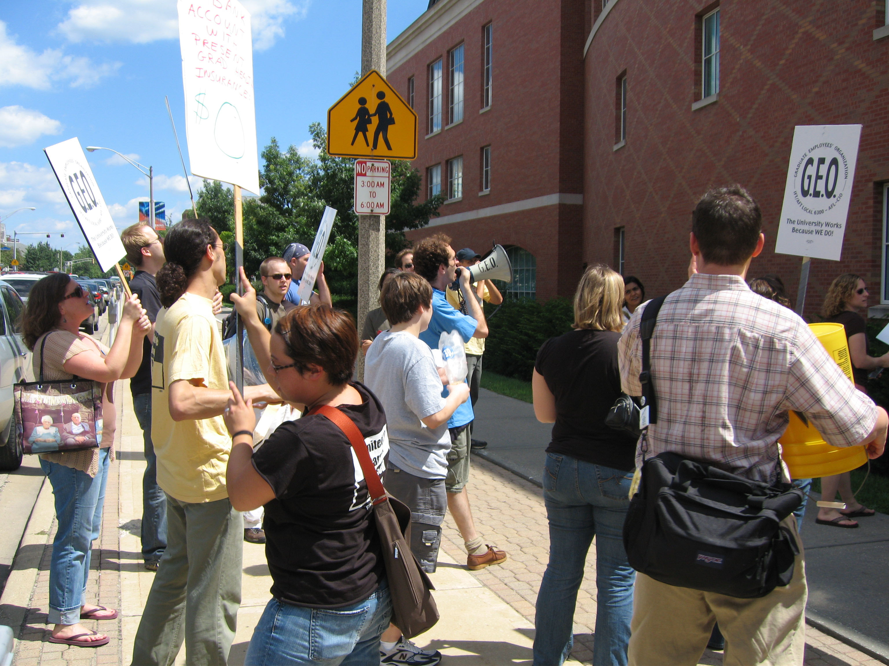 Freezing wages is a standard bargaining tactic by the administration. During the last contract negotiations in 2004, the university used this as leverage to have the GEO quickly agree to a wage and fee structure. They want either to coerce the GEO to agree quickly to a low wage increase or publicly blame GEO for the absence of a raise. The proposal that the university currently has on the table calls for NO guaranteed wage increase ever and NO guaranteed minimum stipend ever. |