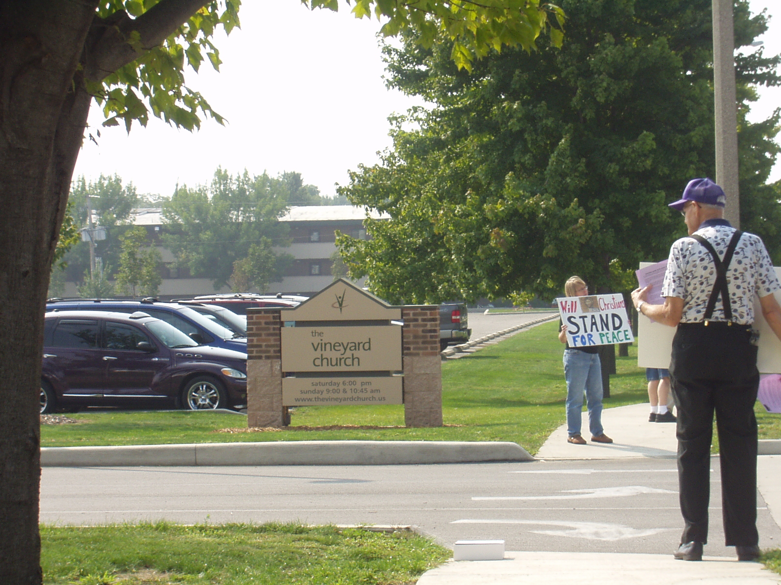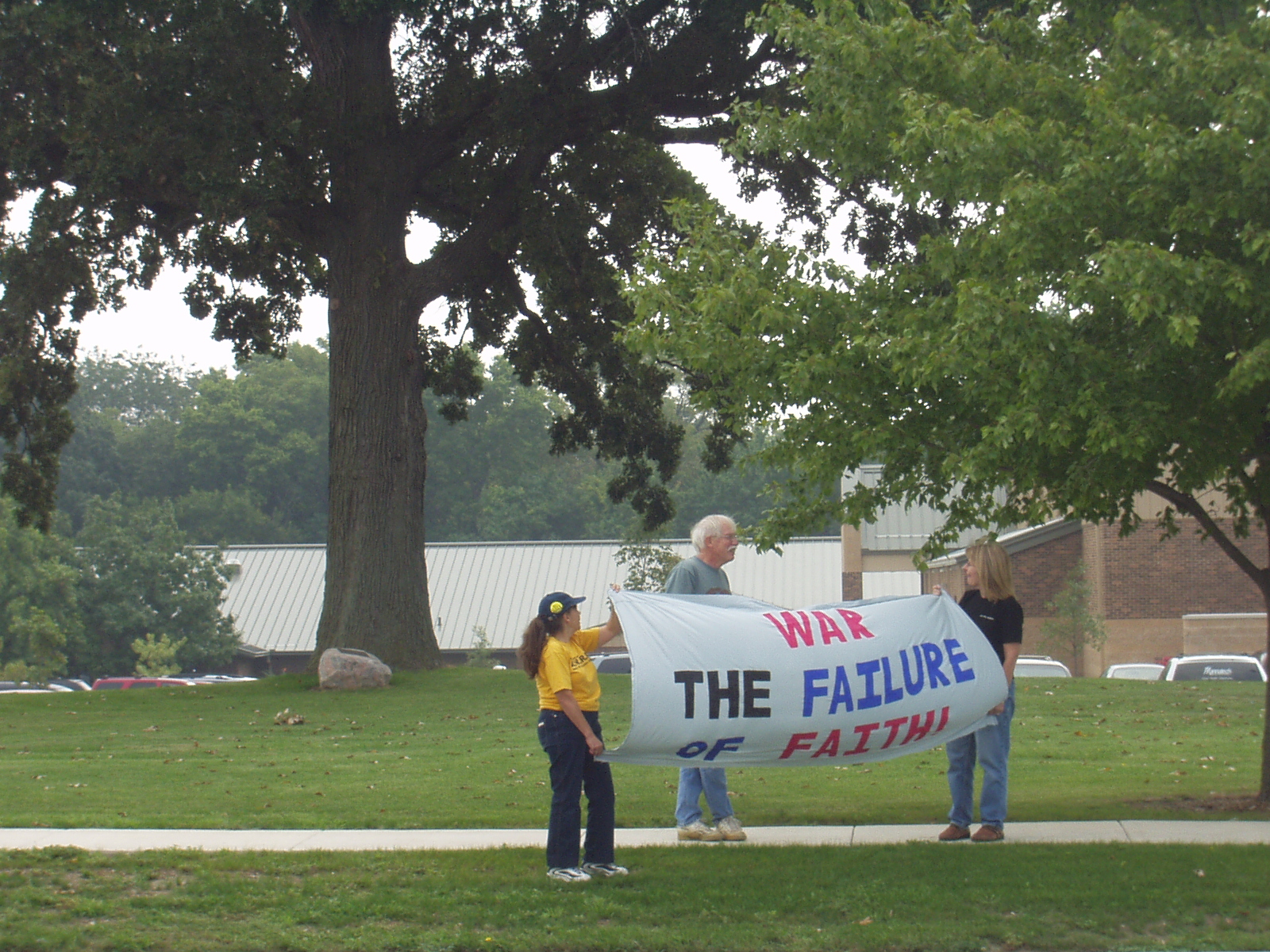Dear What a Pity (PS):AWARE has tried many times to discuss and work with churches. Many like the CUCC are wonderful and accepting even of those who do not agree with each of their beliefs. Others are not willing to talk about a Christian response to our current war. Some churches say only that they pray for our leaders and support the troops and take no stand on what is being done in our name with our tax dollars. Much like the church in Germany during the time of Hitler. Many in our group are outside a church because their faith compels them to be there. You can judge them and say we should work with those inside the church for change. A 25-year member of the Vineyard tried to do that. She was also an eight-year employee and when she tried to work for peace inside she was fired. She made a sacrifice for her beliefs. We heard one of the pastors tell her that the Vineyard had grown so large and big that they could no longer be merciful. That’s not Christian, even if a pastor says it. Judge and condemn us if you want. By the way unless you were there you might not know the number of those present on Sunday was more than you think. There is a lot of real estate there and we had 3 entrances to cover. It did look like rain, but when our group arrived the clouds disappeared and the sun was shinning. But if we ever do need an umbrella it will be big enough for all who want to work for peace no mater where it takes us. |