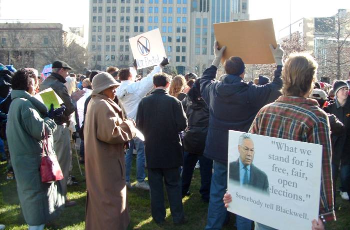 Demonstration & picketing (on the public sidewalk, not on private property) in front of Secretary of State Blackwell's office.