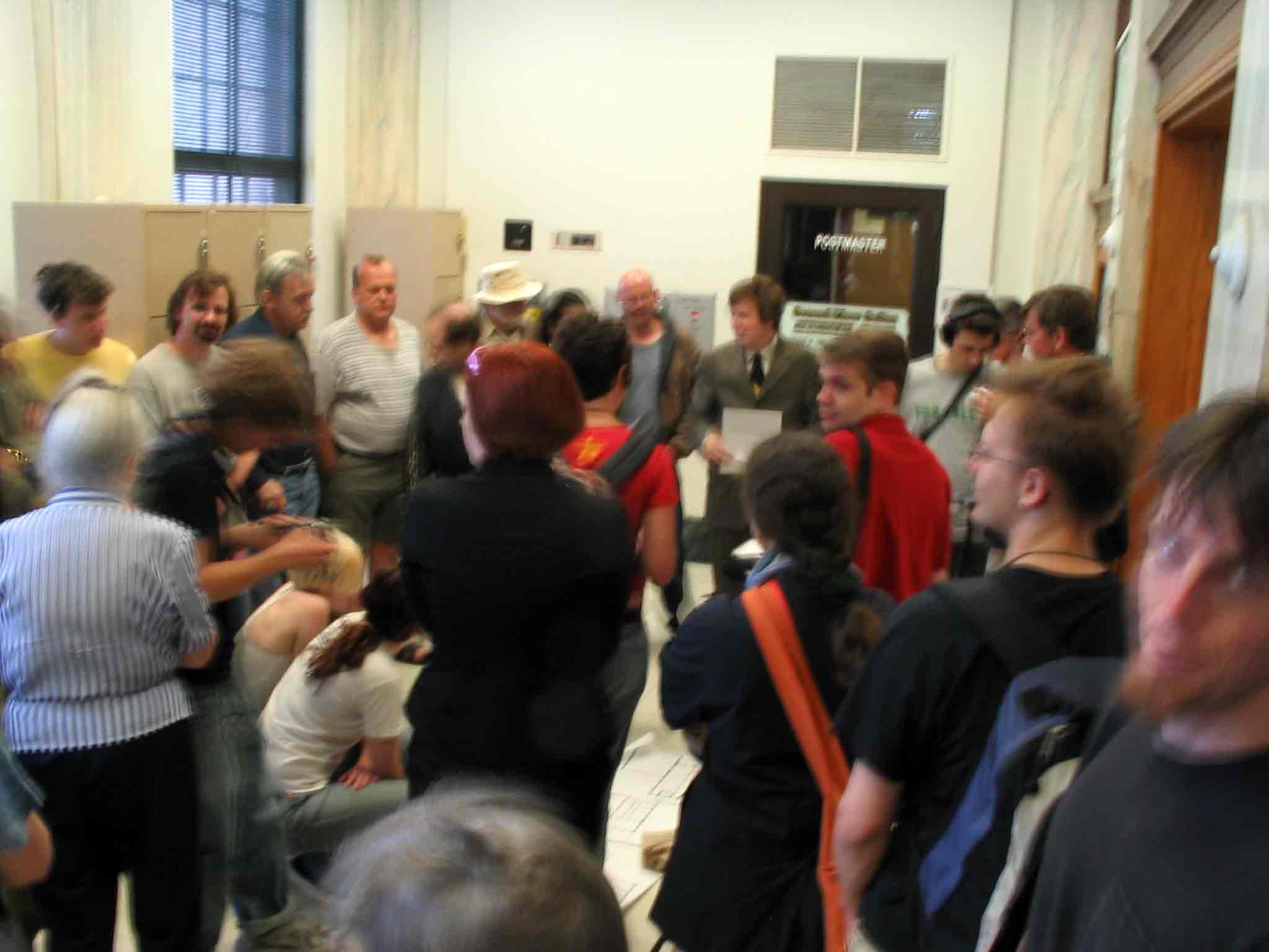 Some 50 people squeezed into the lobby of the post office building as rainy weather threatened the press conference originally scheduled for the front steps. Here are a couple of photos. |