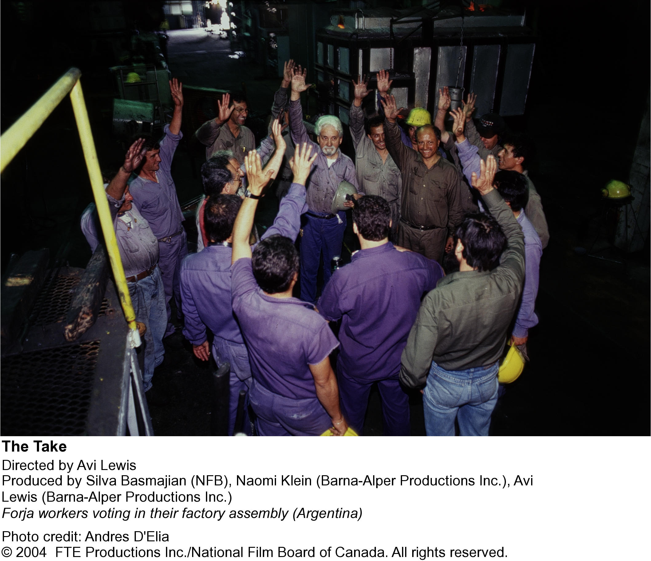 In suburban Buenos Aires, thirty unemployed auto-parts workers walk into their idle factory, roll out sleeping mats and refuse to leave. All they want is to re-start the silent machines. But this simple act - the take - has the power to turn the globalization debate on its head. Armed only with slingshots and an abiding faith in shop-floor democracy, the workers face off against the bosses, bankers and a whole system that sees their beloved factories as nothing more than scrap metal for sale. With "The Take", director Avi Lewis, one of Canada's most outspoken journalists, and writer Naomi Klein, author of the international bestseller No Logo, champion a radical economic manifesto for the 21st century.