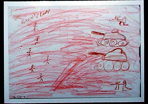 As an elementary school teacher the most moving part of the presentation for me was the passing of the children's art work to those present. I saw pictures just like those my 6-7 year old children draw each day. The difference that causes me the most turmoil is the fact that the pictures also include a U.S. presence. The U.S. manufactured helicopters hovering over the fields of flowers and the children playing below was sickening. Below lay the dead and dying and I became even more aware of children like those I see at school each day living in fear as their art work displayed.